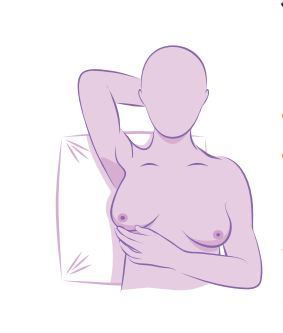 Start with one hand behind your head, then use the pads of two or three fingers on your other hand to feel each breast in an up-and-down or spiral motion. It’s important to cover the entire breast and surrounding breast tissue, which extends to the collar bone, sternum, first rib, and underarm area.
