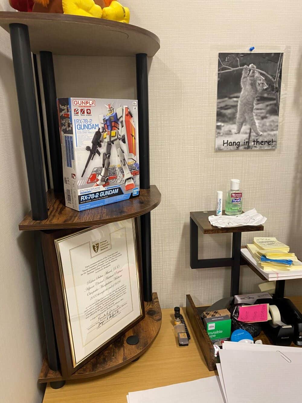 At his desk, he finds a list of the day’s scheduled patients on his keyboard. Near it are a Marvel birthday-party hat; an article entitled The Impact of Coffee on Health; an anime action-figure (Gundam Wing) building kit; and a framed certificate from the Heritage College of Osteopathic Medicine that reads, “Rukan Salim Ahmed, DO, Adjunct Clinical Professor.” His white doctor’s coat hangs on the back of his chair, where it stays all day. He actually prefers not to wear it around patients.