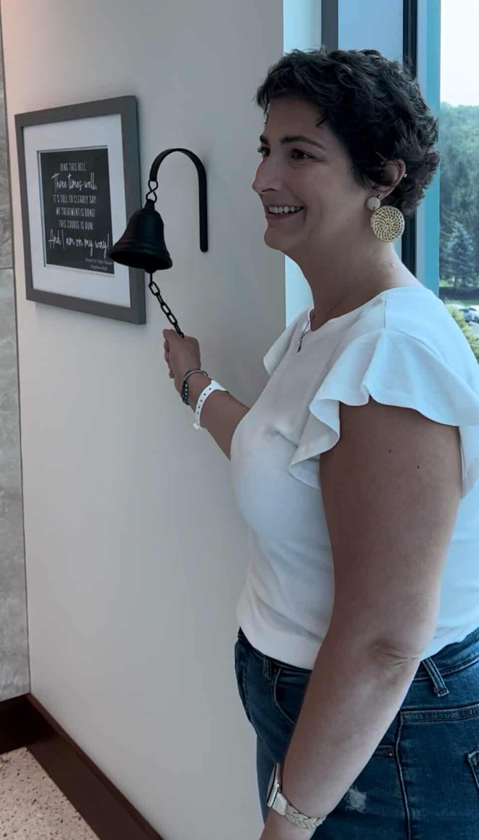 On her last day of immunotherapy, Abby went down to the infusion floor to ring the bell that signals the end of a patient’s cancer treatment. Denise was working that day and watched with Abby’s friends and family.
